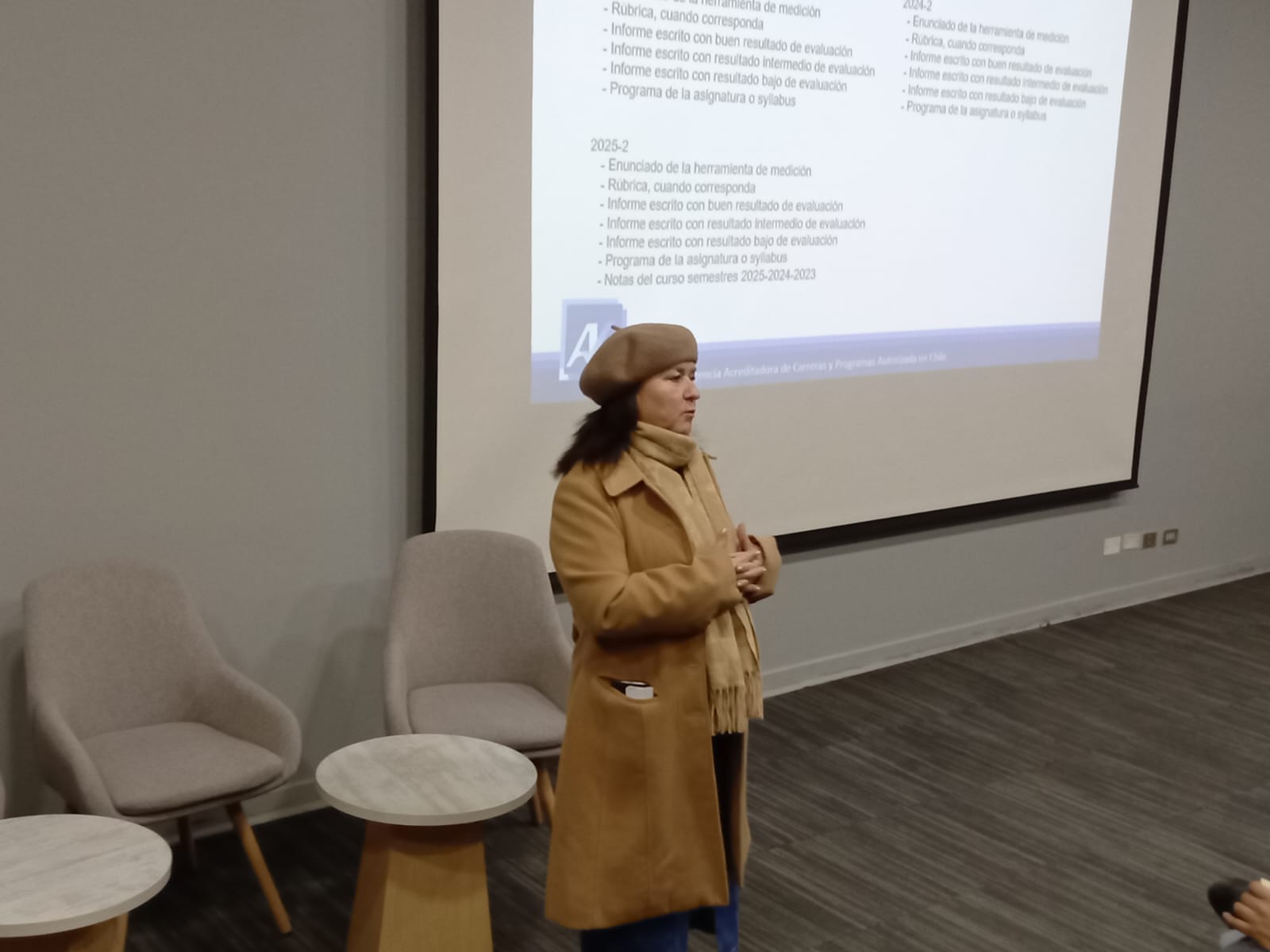 En la apertura de la jornada, la Secretaria Académica de la facultad, Dra. María José Retamal, presentó la programación del semestre. Detalló las metas y objetivos a alcanzar, así como las actividades clave que se realizarán.