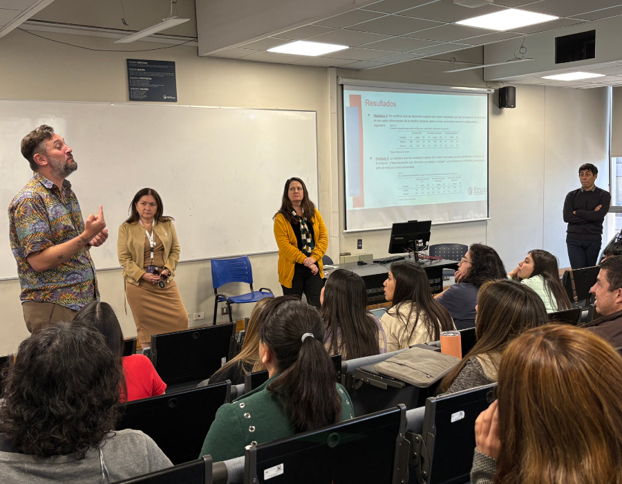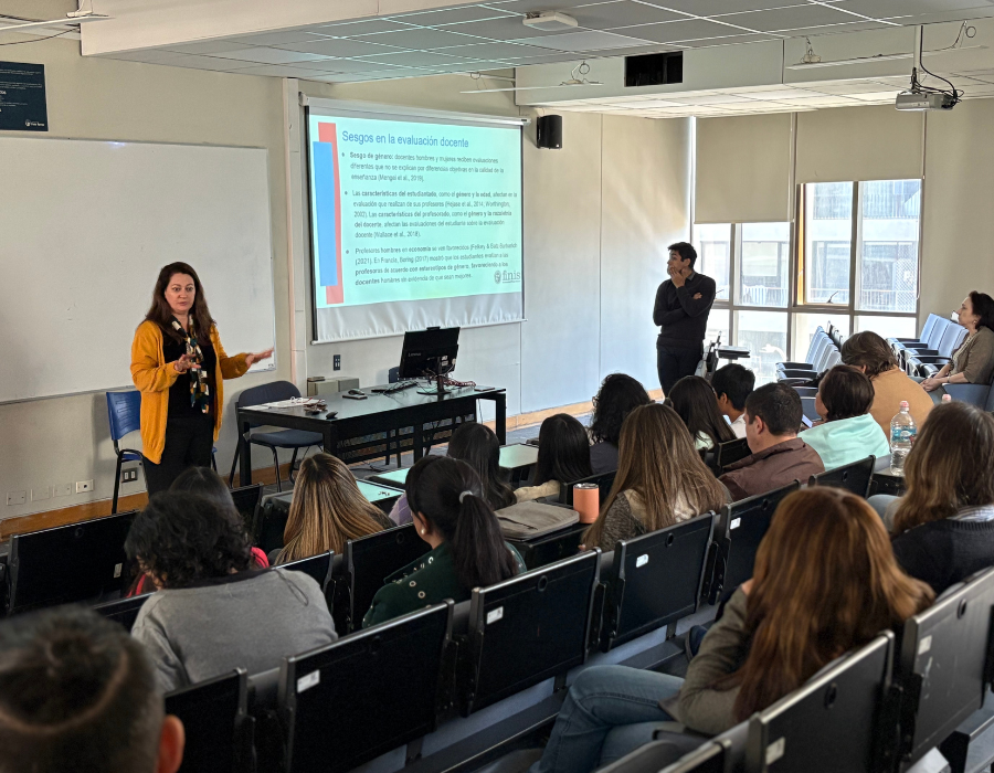 Cerro la conversación la Dra. Rosario Undurraga, Doctora en Sociología, profesora titular de la Escuela de Ciencias de la Familia y académica del Doctorado en Educación, y Emilio Guerrero, Coordinador de Asuntos Docentes, articularon su exposición con base en el artículo “Profesores en evaluación: el impacto del género en los resultados de la evaluación docente universitaria”, coautoría con José Tomás Montalva y el Centro de Innovación Docente. El estudio (2022–2024) muestra que, en promedio, las docentes mujeres obtienen mejores resultados en cuatro dimensiones de la práctica docente; la recomendación global del estudiantado se mantiene equivalente a nivel institucional, aunque en unidades altamente generizadas la evaluación y la recomendación convergen a favor de las docentes mujeres.