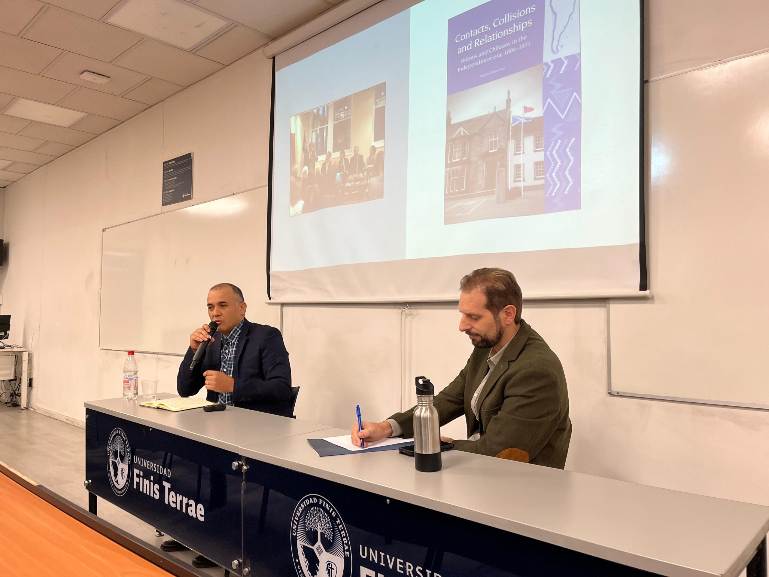 - Andrés Baeza junto a Raimundo Meneghello en medio de la charla “De amenaza existencial a aliado potencial: El Imperio británico y la independencia de Chile 1806-1831”,
