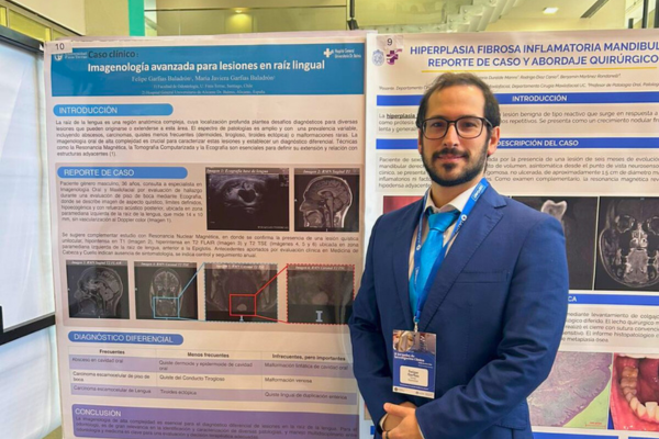 El Dr. Felipe Garfias Baladrón, docente de imagenología, fue autor en tres trabajos presentados en la jornada, presentando personalmente el póster titulado «Caso Clínico: imagenología avanzada para lesiones en raíz lingual«.