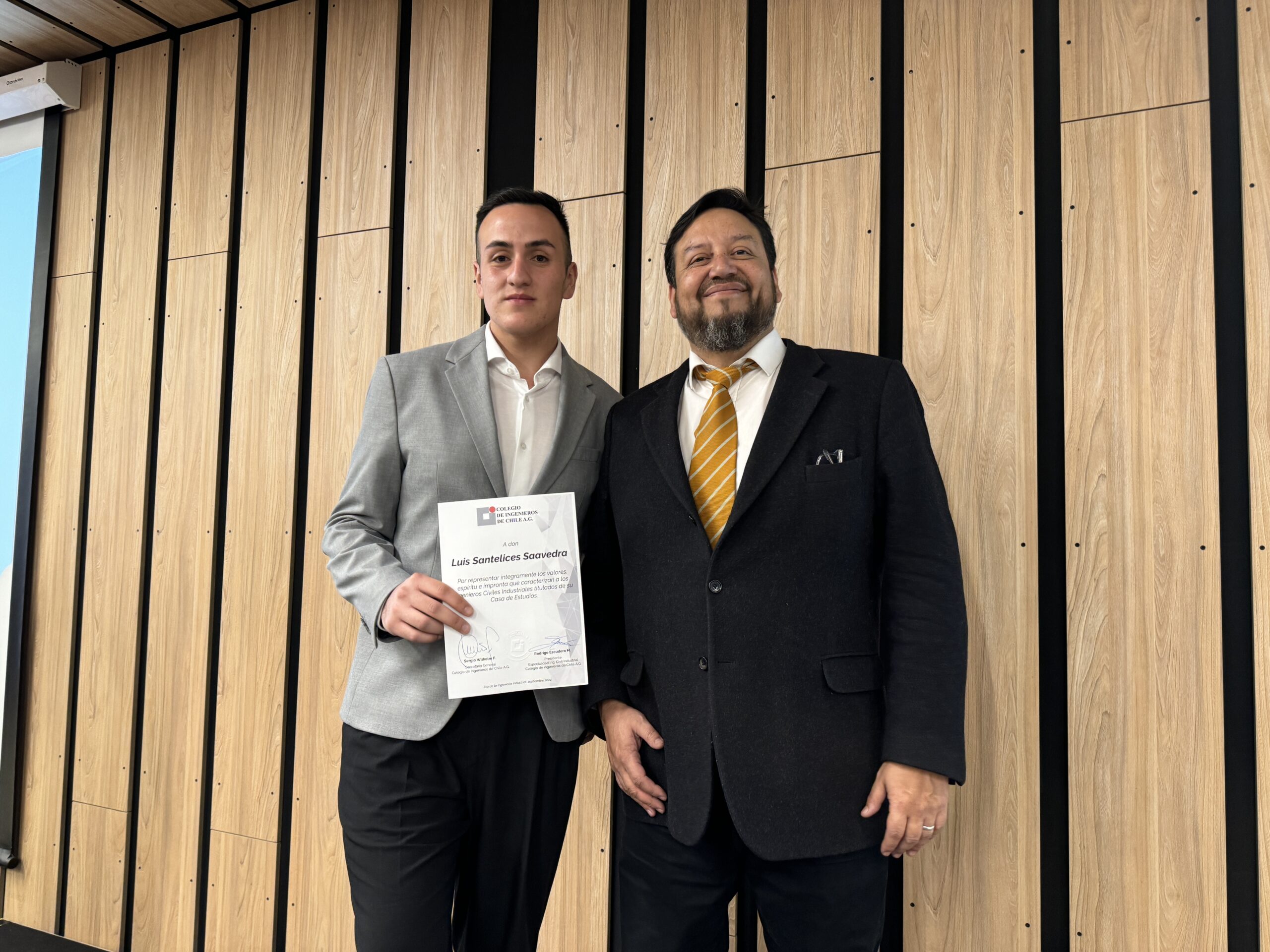 Durante la ceremonia, se premiaron a los mejores egresados de la especialidad Industrial de cada una de las universidades participantes. Por la Universidad Finis Terrae, el galardón fue otorgado a Luis Renato Santelices Saavedra, mejor egresado de Ingeniería Civil Industrial 2023. El premio fue entregado por la decana Urrutia y el director de la Escuela de Ingeniería Civil Industrial, Luis Lino.