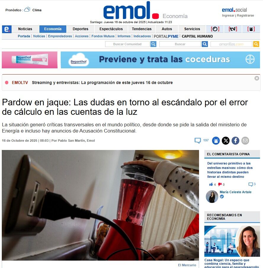 El medio electrónico señala que las dudas en torno al escándalo por el error de cálculo en las cuentas de la luz generó críticas transversales en el mundo político, desde donde se pide la salida del ministro de Energía, Diego Pardow, e incluso hay anuncios de Acusación Constitucional.