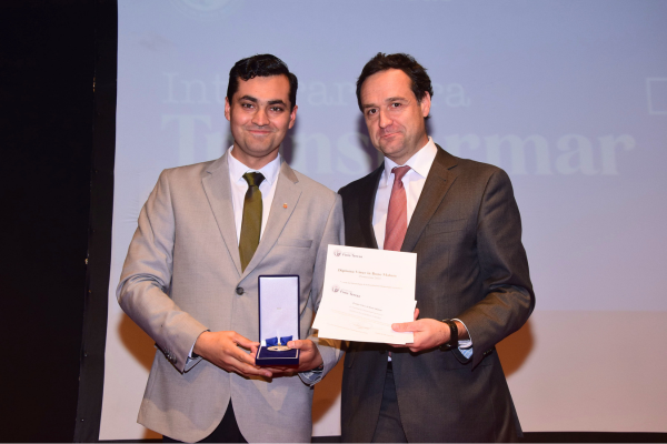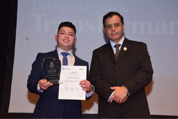 Este premio, otorgado a un titulado destacado por cada generación de egresados, reconoce a aquellos jóvenes que han encarnado a la perfección los valores y el sello institucional: compromiso social, excelencia académica y una activa participación en la vida universitaria. El Dr. Campbell Fuentes se ha distinguido durante su paso por la Universidad Finis Terrae por su excepcional trayectoria académica, su profundo compromiso con el bienestar social y su activa participación en las diversas actividades e iniciativas de la vida universitaria. Su espíritu inquieto, su liderazgo natural y su constante búsqueda por el conocimiento lo han convertido en un referente para sus compañeros y un orgullo para la comunidad Finis Terrae. El Reconocimiento Vince in Bono Malum fue entregado por el Vicerrector Académico de la Universidad Finis Terrae, Juan Eduardo Vargas.