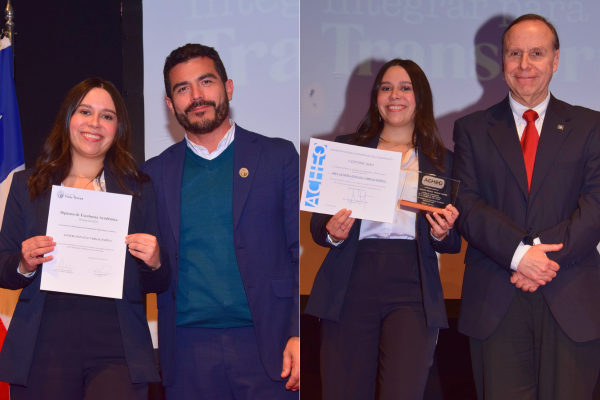 Doble reconocimiento a la Dra. Javiera Ignacia Vargas Espina: Premio a la Trayectoria Académica de ACHEO y Premio a la Excelencia Académica de la Universidad Finis Terrae, un merecido homenaje a su trayectoria y excelencia. El Premio a la Trayectoria Académica, otorgado por ACHEO, es una distinción que se concede a aquellos profesionales que han dedicado su formación al desempeño de la excelencia, contribuyendo significativamente al mejoramiento de la salud bucal de la población chilena. El Premio a la Excelencia Académica, otorgado por la Universidad Finis Terrae, reconoce el excepcional rendimiento académico de la Dra. Vargas Espina, así como su dedicación, perseverancia y pasión por el aprendizaje. Ambos premios son un reflejo de su compromiso con la odontología y su constante búsqueda por el conocimiento. El premio a la Trayectoria Académica de ACHEO fue entregado por el Dr. Ángel Fernández Clarke y el premio a la Excelencia Académica lo entregó el Dr. Victor Polanco, Vicerrector de Investigación, Creación Artística y Doctorado.