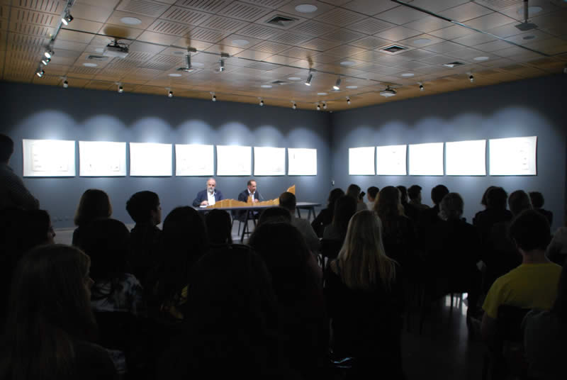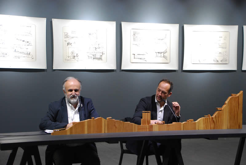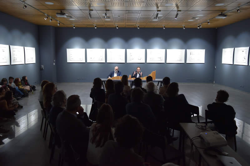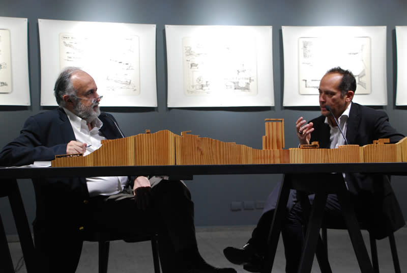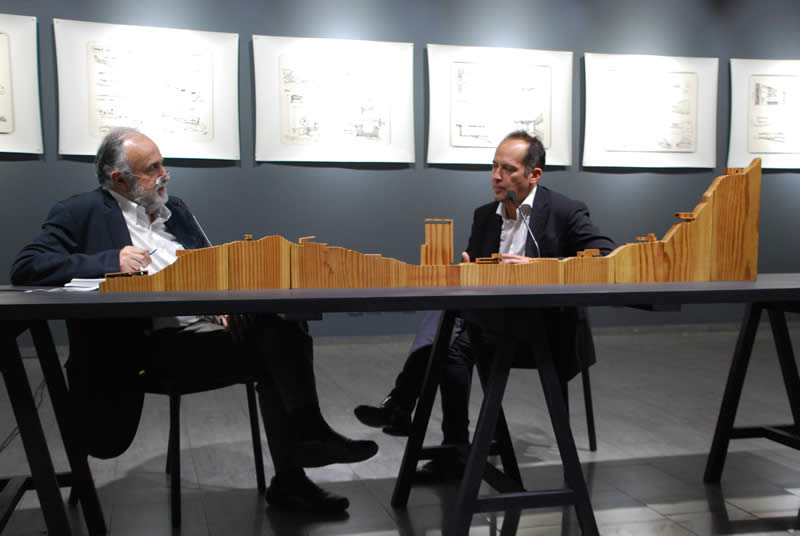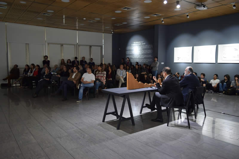 Marco Antonio de la Parra, director de la cátedra, fue el encargado de conversar con el destacado arquitecto, quien durante su presentación explicó en detalle su obra.