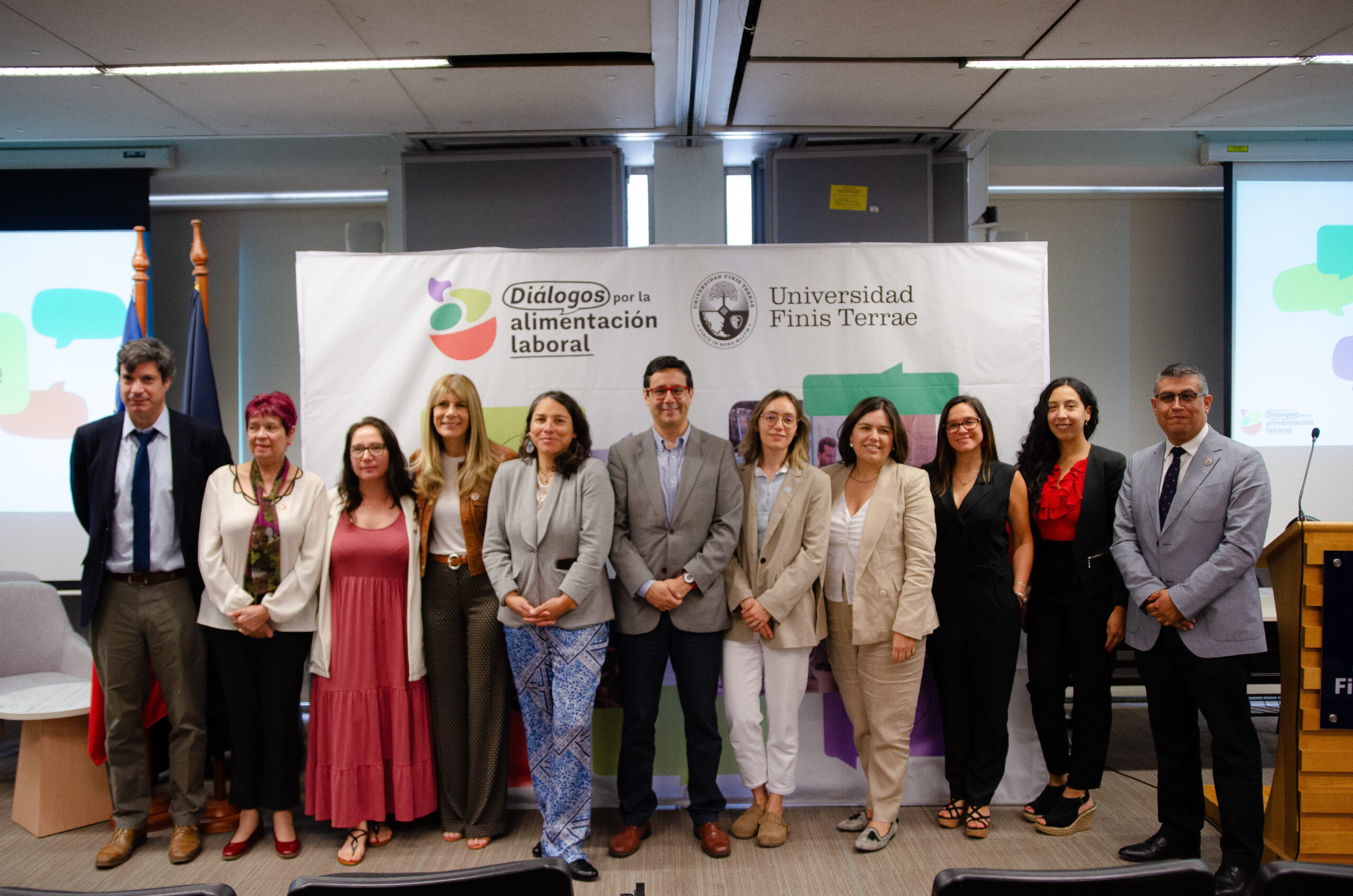 - De izquierda a derecha: Sebastián Pavlovic, académico Facultad de Medicina U. Finis Terrae; Amalia Pereira, consejera nacional Central Unitaria de Trabajadores (CUT); Ilia González, Directora Ejecutiva, Red de Recursos Humanos; Ximena Rincón, Senadora de la República de Chile; Camila Silva, jefa de división de Políticas Públicas, Ministerio de Salud; José Francisco Castro, Intendente de Seguridad y Salud en el Trabajo, Superintendencia de Seguridad y Salud en el Trabajo; Ornella Tiboni, especialista en nutrición y sistemas alimentarios, Organización de las Naciones Unidas para la Alimentación y la Agricultura (FAO); Magdalena Mardones, coordinadora nacional de procesos de enfermería, Asociación Chilena de Seguridad (ACHS); Andrea Cortés, socia Corporación Actuemos; Mylene Jequier, nutricionista Programa de Salud y Bienestar Laboral, INTA U. de Chile; Oscar Castillo, director Escuela de Nutrición y Dietética U. Finis Terrae.
