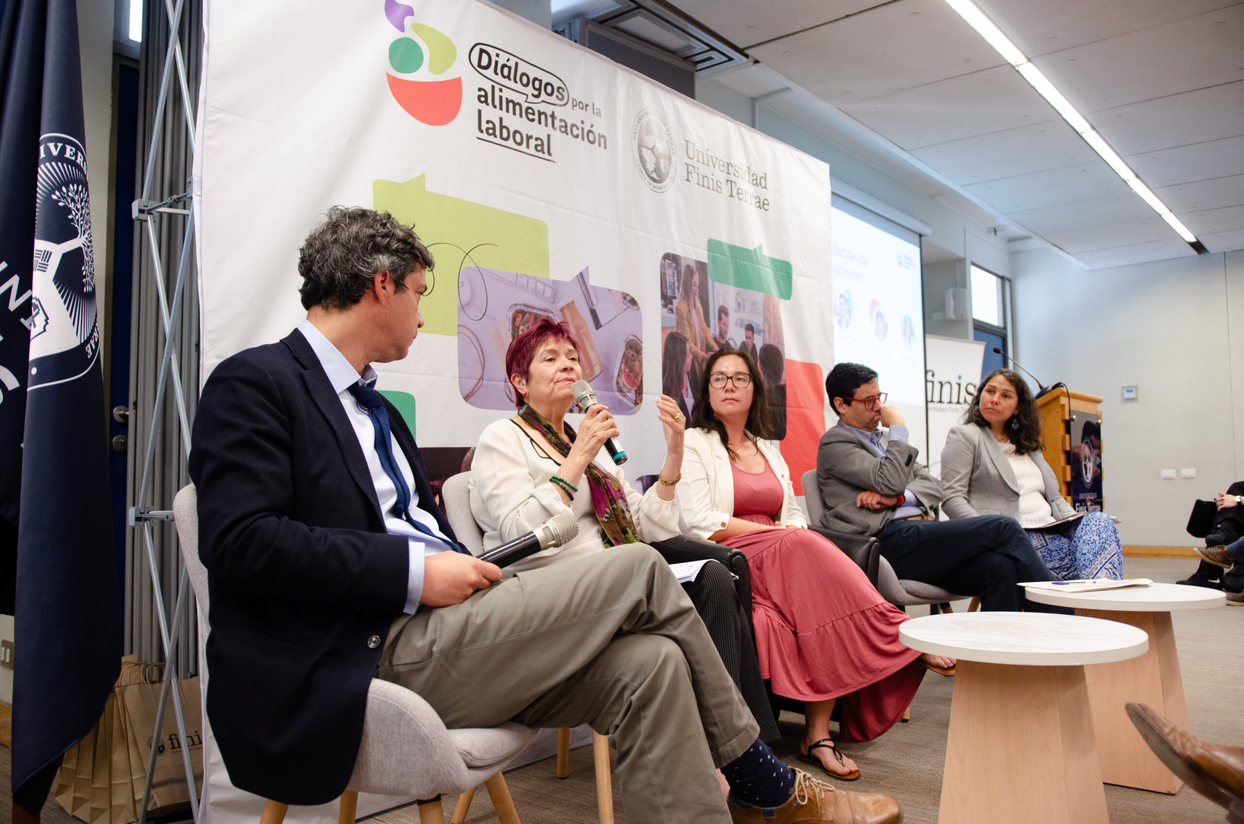 - De izquierda a derecha: Ornella Tiboni, especialista en nutrición y sistemas alimentarios, Organización de las Naciones Unidas para la Alimentación y la Agricultura (FAO); Magdalena Mardones, coordinadora nacional de procesos de enfermería, Asociación Chilena de Seguridad (ACHS); Oscar Castillo, director Escuela de Nutrición y Dietética U. Finis Terrae; Andrea Cortés, socia Corporación Actuemos; Mylene Jequier, nutricionista Programa de Salud y Bienestar Laboral, INTA U. de Chile.