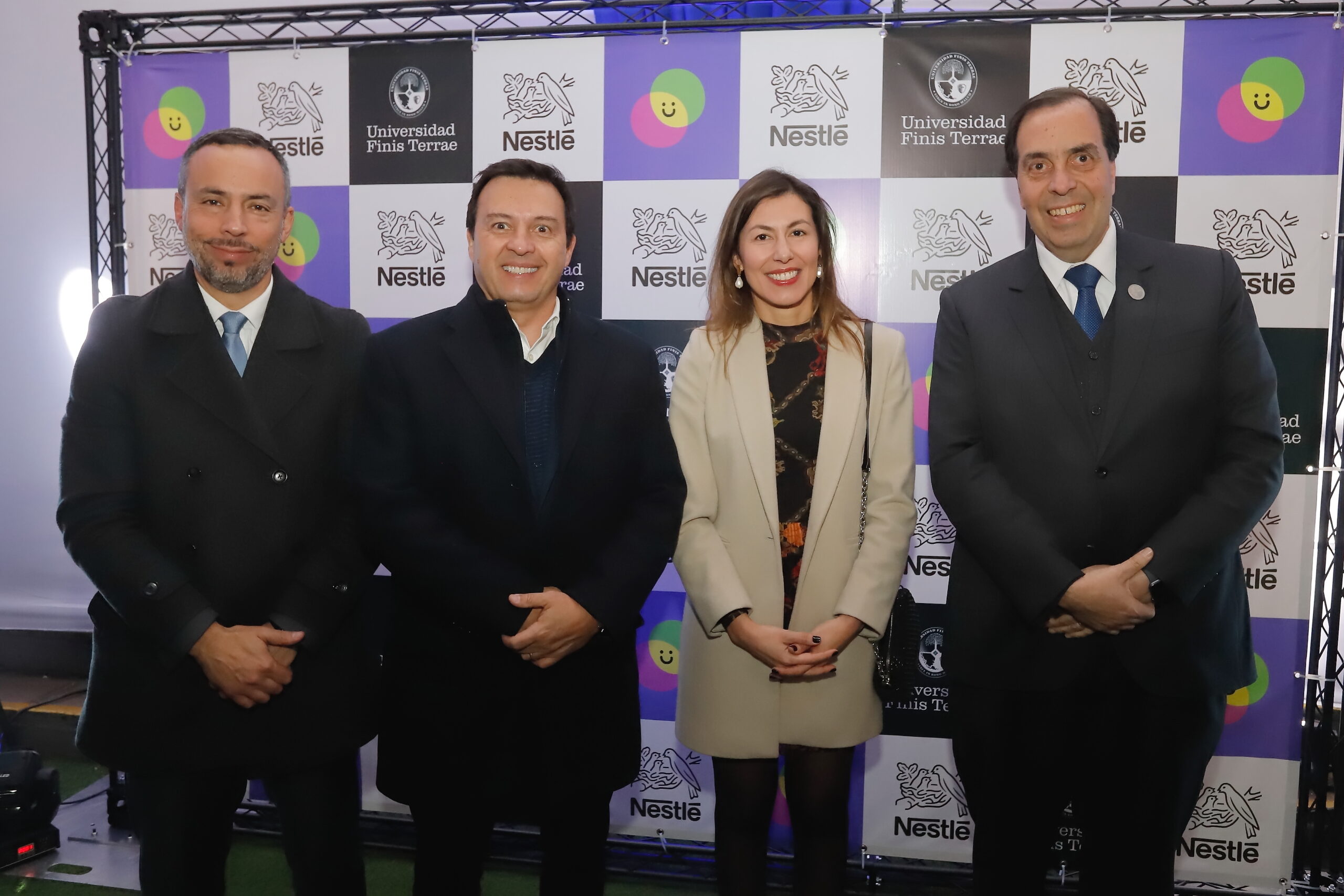 - De izquierda a derecha: Ernesto Vega, decano de la Facultad de Medicina de la U. Finis Terrae; Rodrigo Camacho, presidente ejecutivo de Nestlé Chile; María Fernanda Torres; directora de Comunicaciones y Marketing Nestlé Chile; Cristian Nazer, rector de la U. Finis Terrae.
