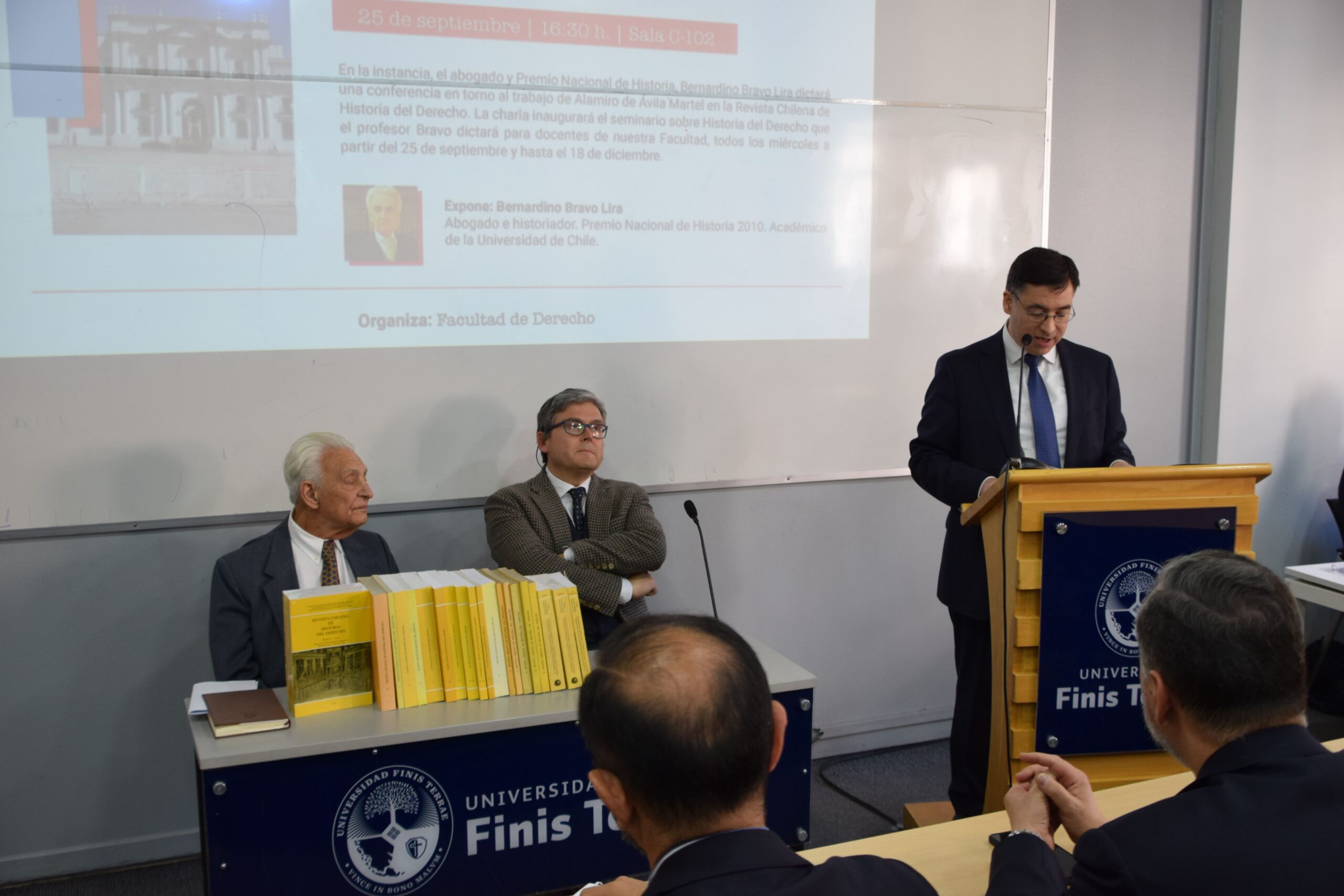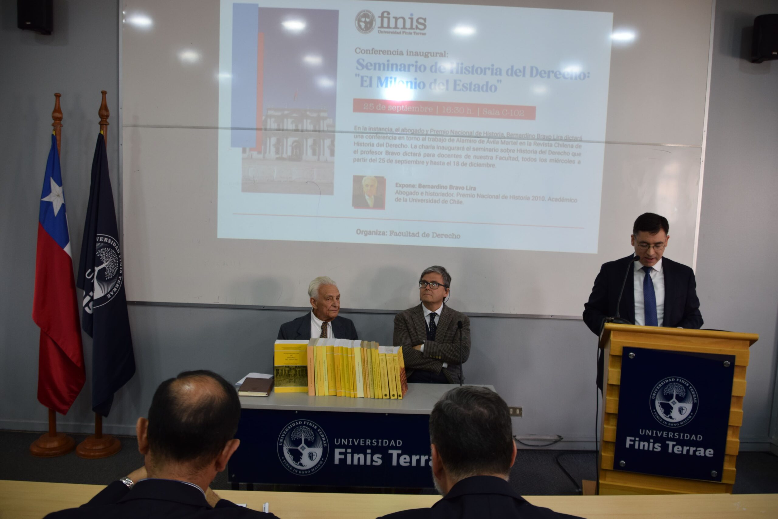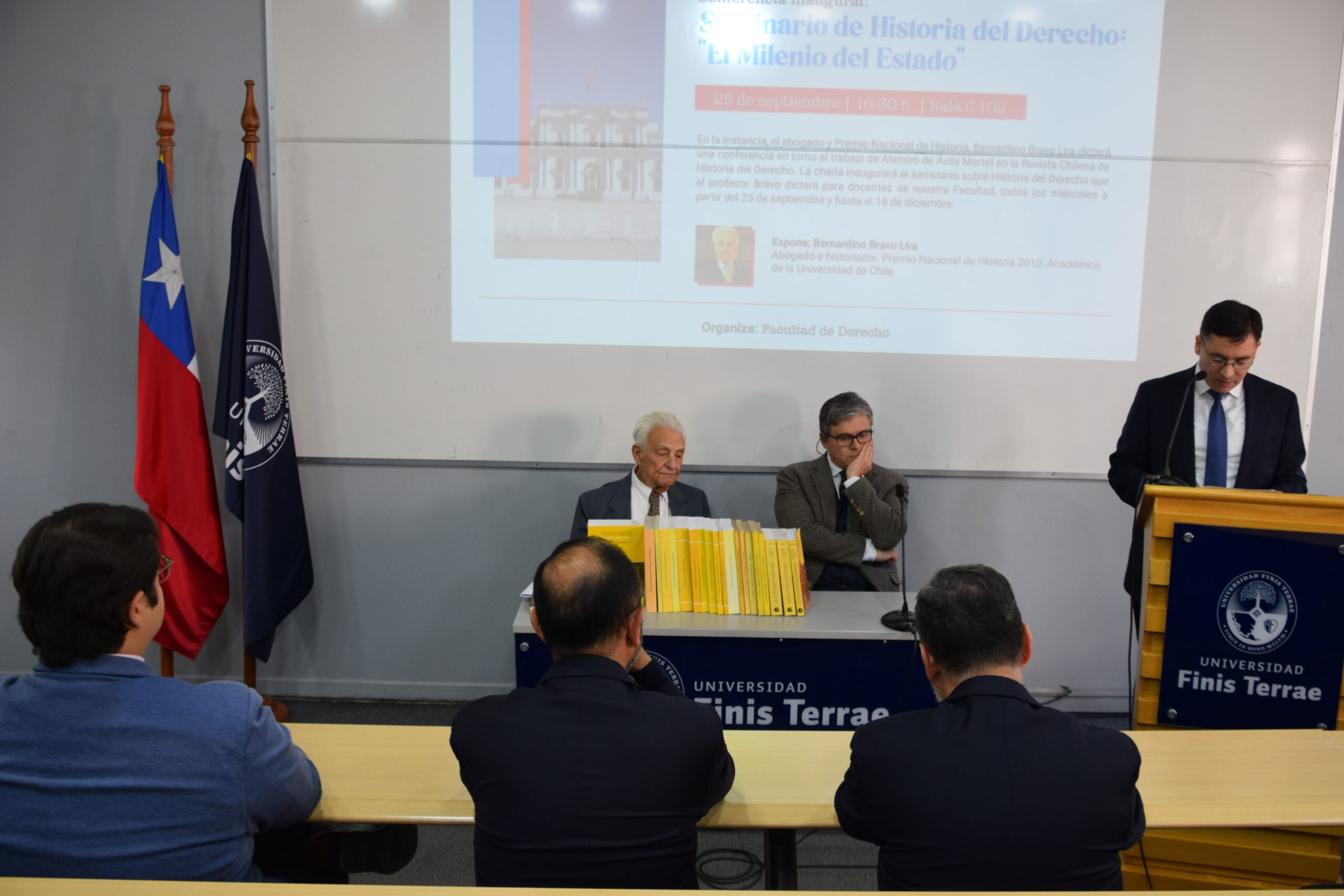 Con un repaso por la extensa trayectoria del historiador y jurista Bernardino Bravo, académico que entre otros reconocimientos ha recibido la Orden Andrés Bello de Venezuela en 1985, el Premio Internacional de Historia del Derecho Indiano Ricardo Levene por su obra «Derecho común y derecho propio en el Nuevo Mundo» en 1990 y el Premio Nacional de Historia en 2010; el director de la Escuela de Derecho de la Universidad Finis Terrae, Marco Antonio Navarro inauguró el seminario de Historia del Derecho “El Milenio del Estado”, que el profesor Bravo dictará para docentes de nuestra Facultad durante tres meses.