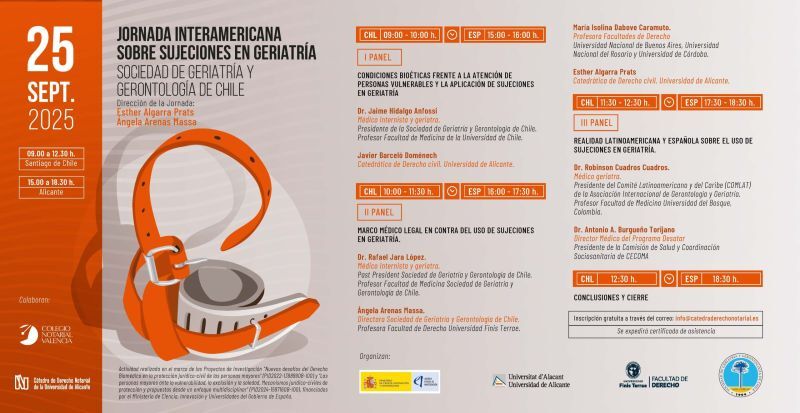 La profesora de la Facultad de Derecho de la Universidad Finis Terrae y Directora de la Sociedad de Geriatría y Gerontología de Chile, Dra. Ángela Arenas Massa, participó como expositora en la Jornada Interamericana sobre Sujeciones en Geriatría, desarrollada de manera online y organizada por el Ministerio de Ciencia, Innovación y Universidades de España, la Universidad de Alicante (España), la Facultad de Derecho de la Universidad Finis Terrae y la sociedad médica chilena de la especialidad ya mencionada.