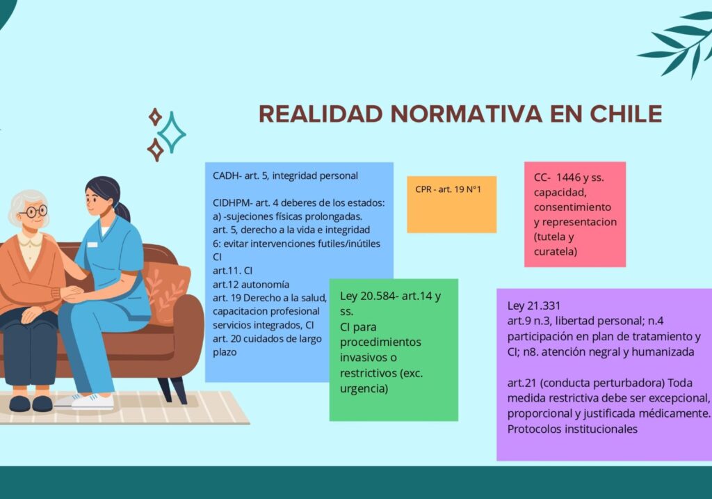 Asimismo, son parte de este entramado normativo: el artículo 19 de la Constitución Política de Chile, que asegura a todas las personas el derecho a la vida y a la integridad física; el artículo 1446 y subsiguientes del Código Civil, que regula la capacidad legal y la incapacidad de las personas para ejercer derechos y contraer obligaciones; así como la Ley 21.331 en su art. 9 n. 3, que versa sobre la protección de los derechos en la atención de salud mental en Chile, y su art. 21 que establece que toda medida restrictiva debe ser excepcional, proporcional y justificada médicamente.