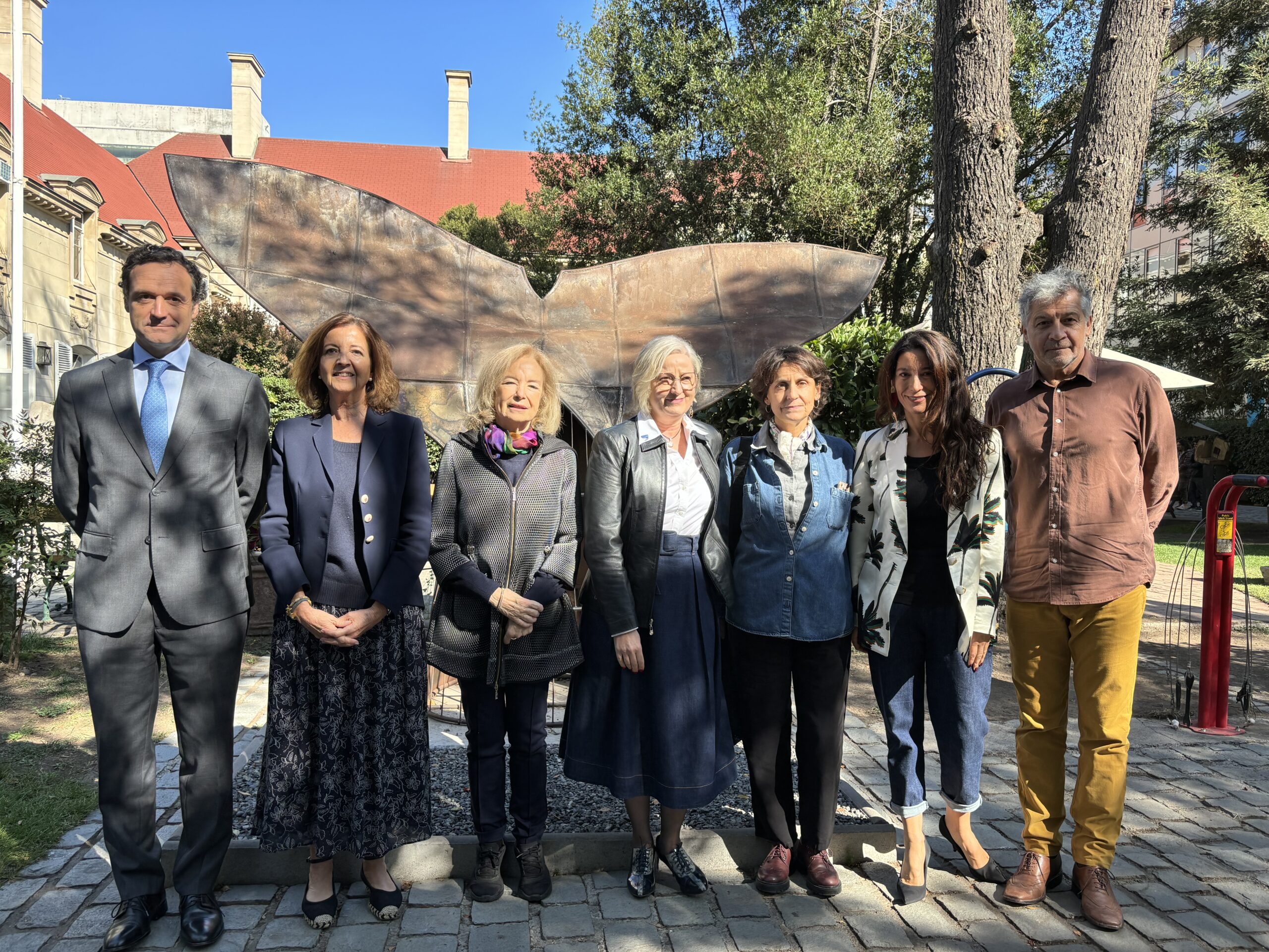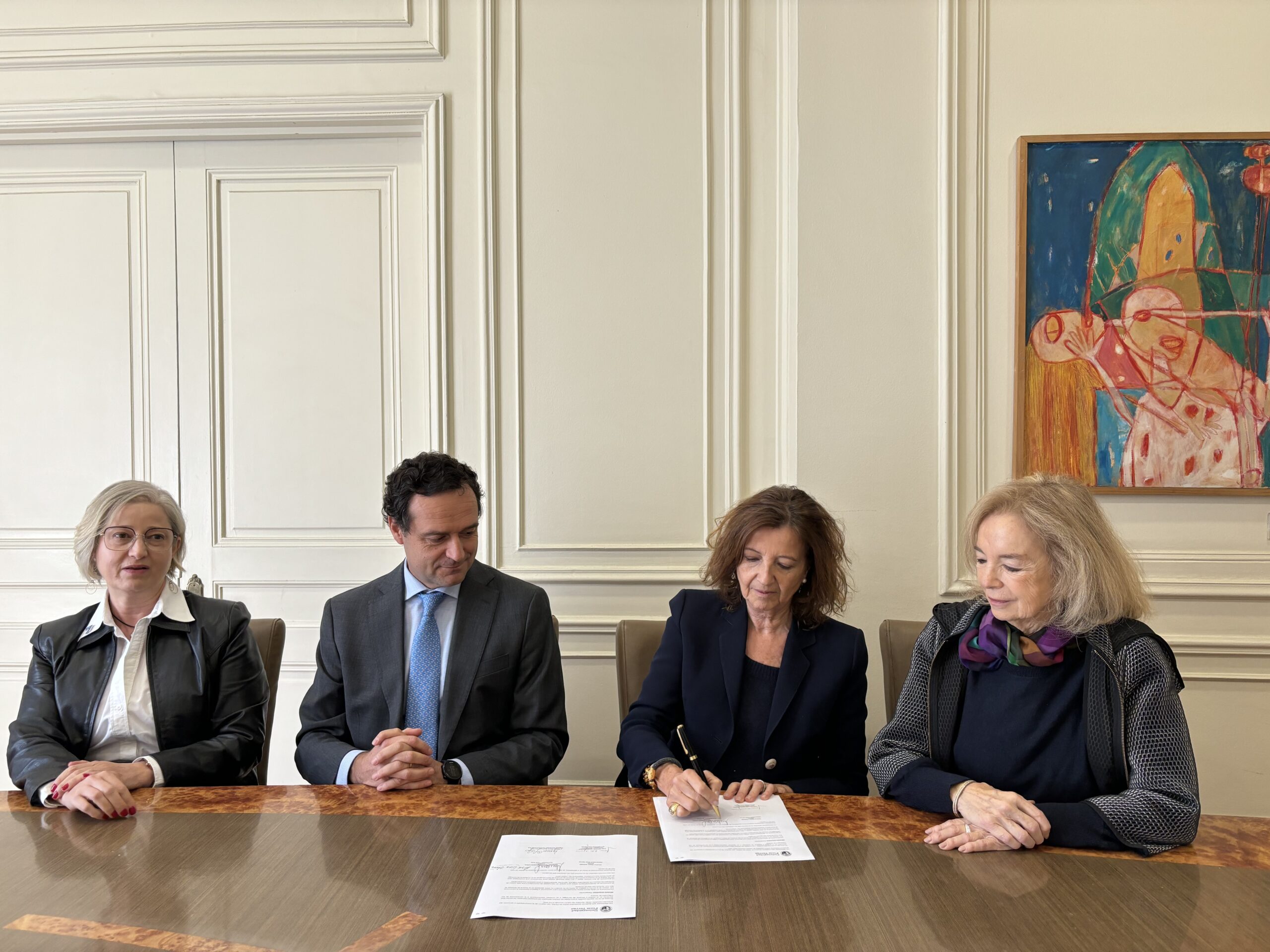 El convenio fue firmado por Juan Eduardo Vargas, vicerrector académico de la Universidad Finis Terrae; María Elena Comandari y Rosita Lira, representantes de Artespacio; y Eliana Restrepo, vicepresidente de talento humano de Seguros Sura Chile.